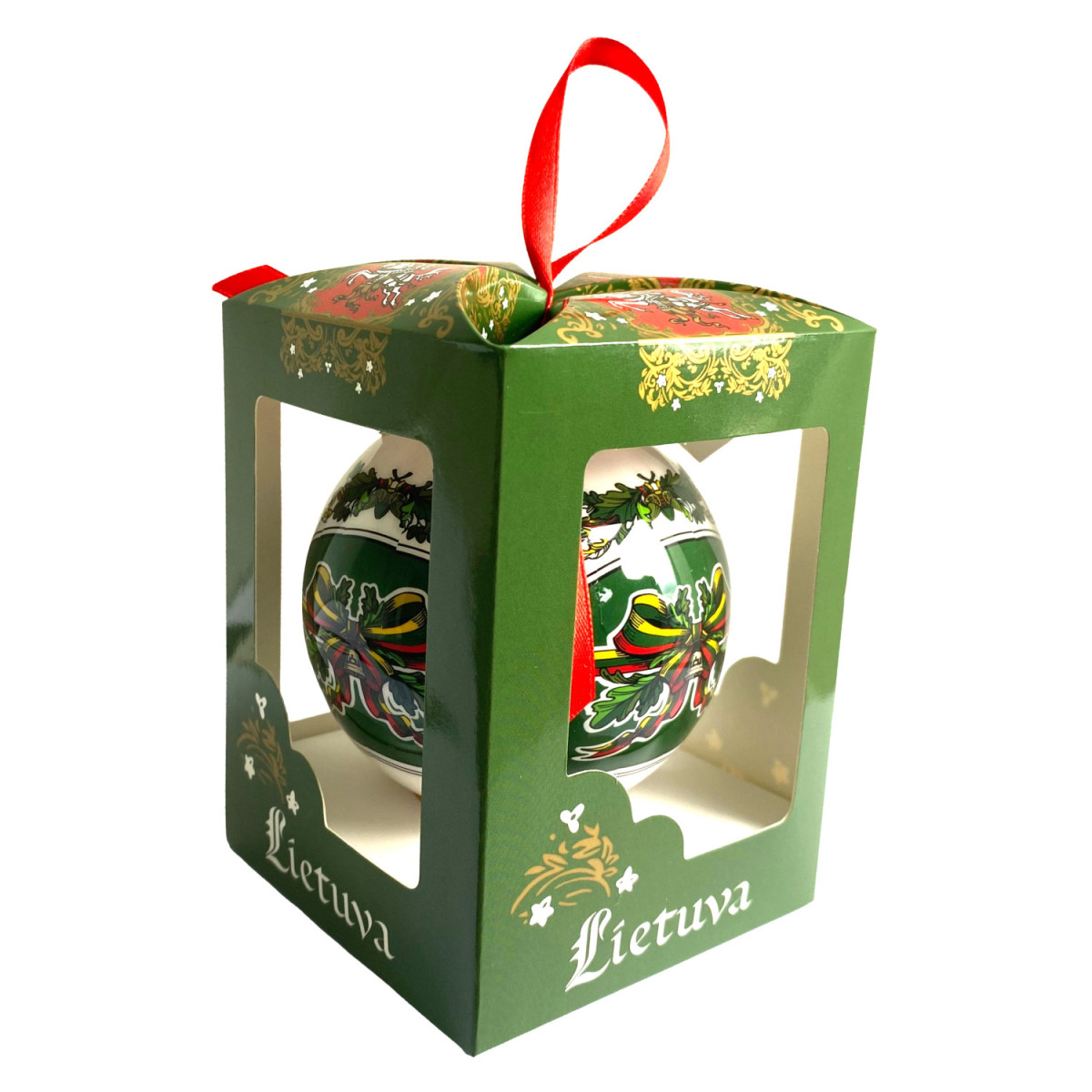 Dekoratyvinis žalios spalvos žaisliukas su Lietuvos simbolika. Raudonas kaspinas suteikia šventiškumo ir išskirtinumo, o dizainą puošia tautiniai motyvai – žalios, geltonos ir raudonos spalvos derinys. Puikiai tinka kaip dovana, tautinis suvenyras.