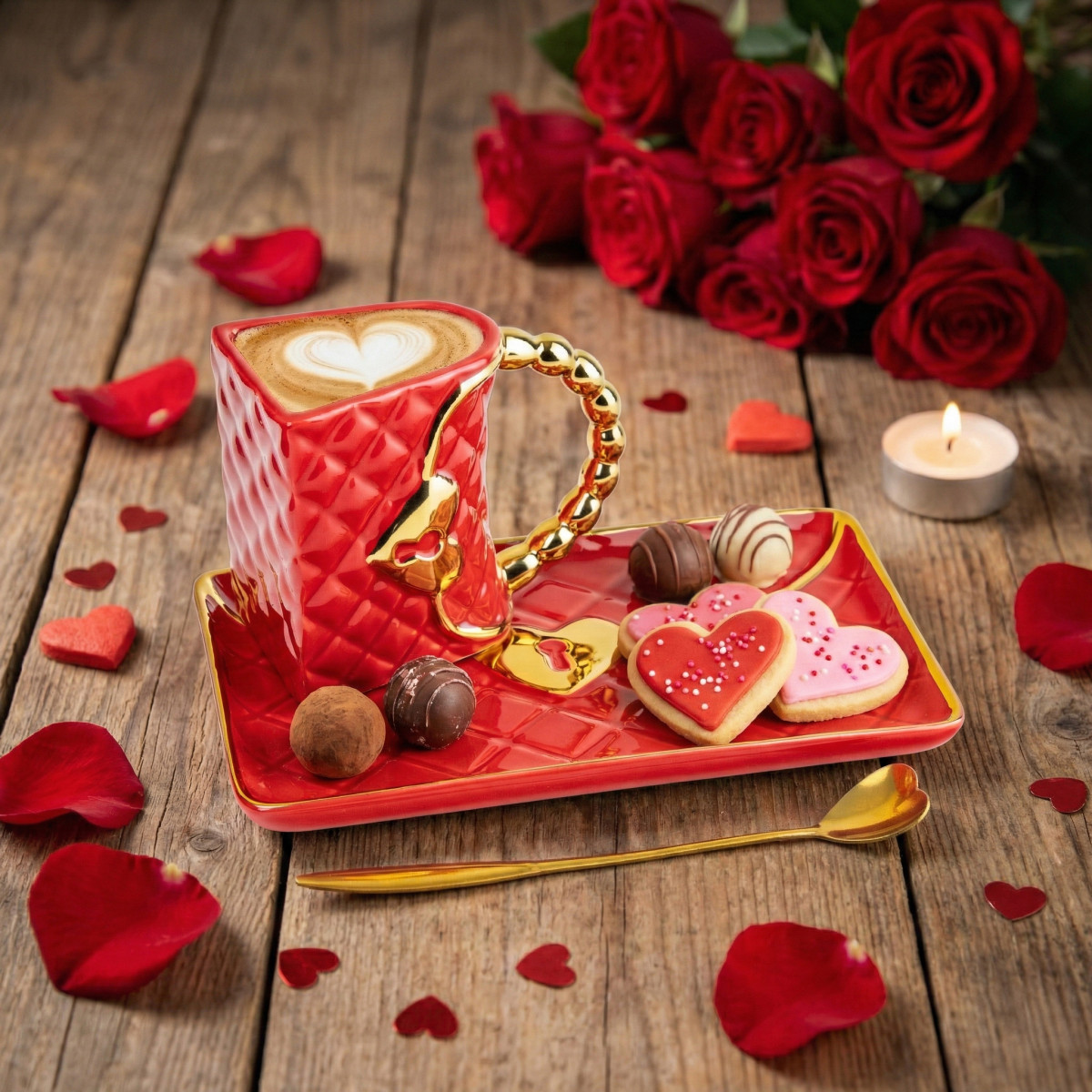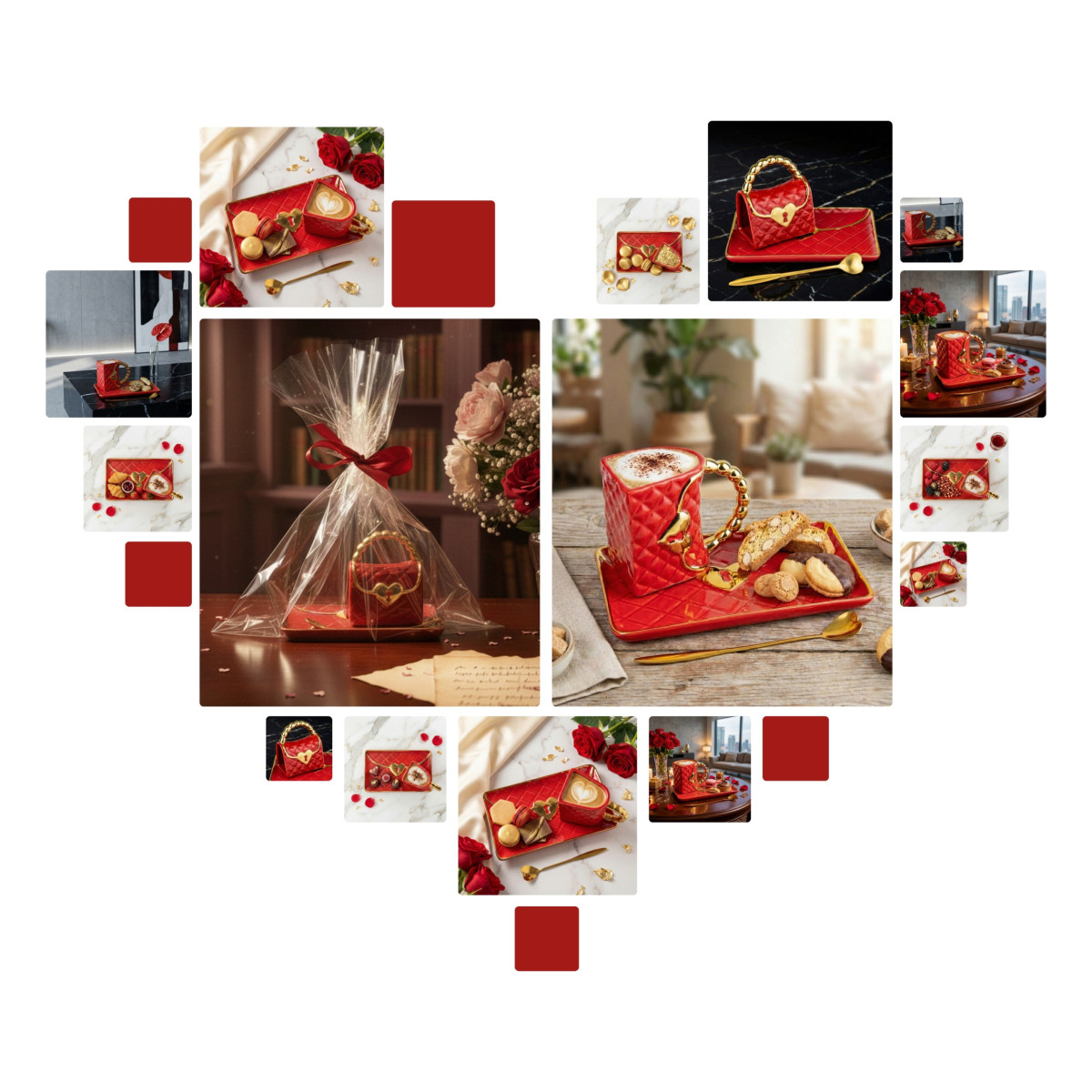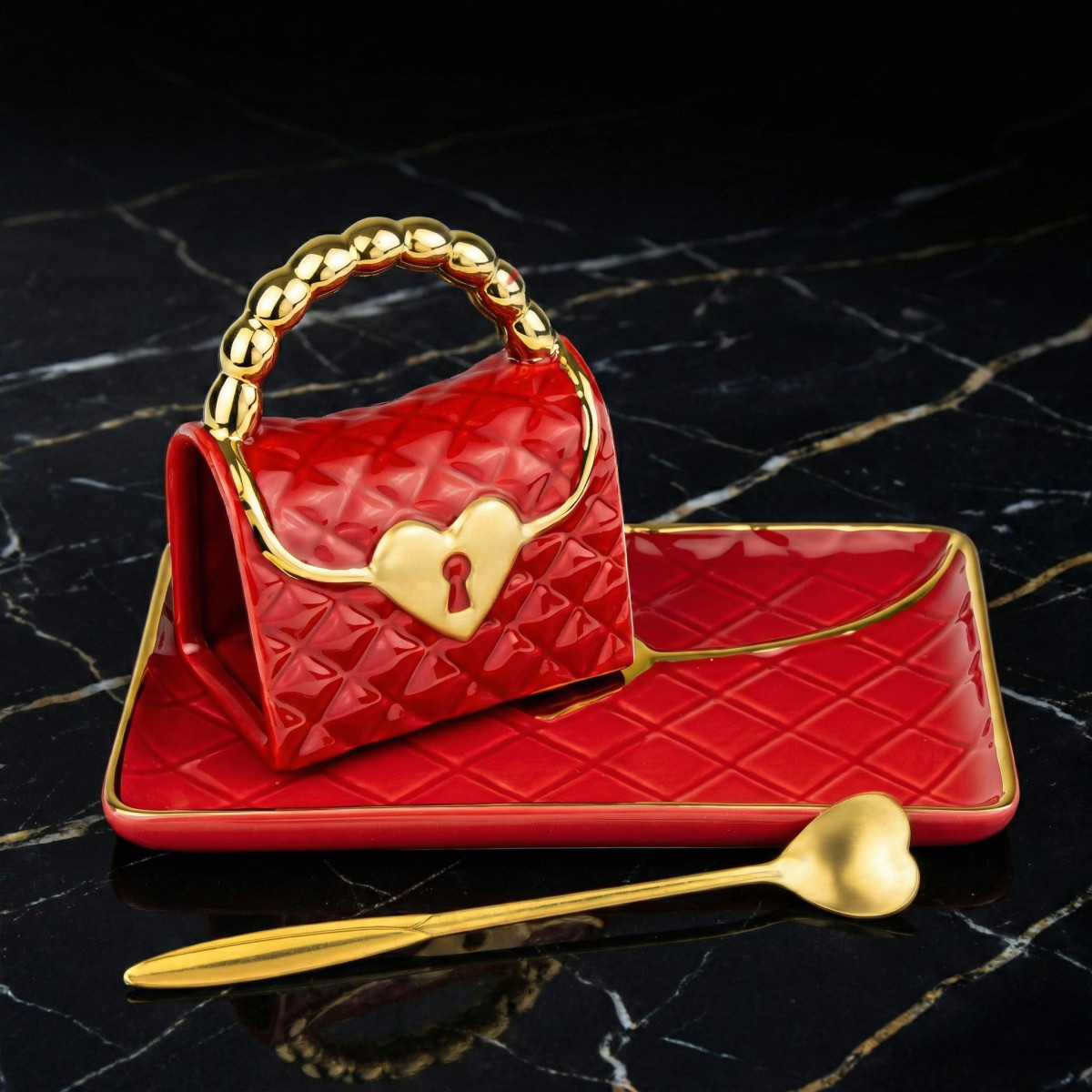 Šis išskirtinis kavos rinkinys sukurtas moterims, kurios vertina stilių, detales ir grožį net kasdienėse akimirkose. Raudonas rankinės formos puodelis, delninukę primenanti lėkštutė ir auksinis širdelės formos šaukštelis sukuria prabangų, mados įkvėptą derinį, kuris nepalieka abejingų.