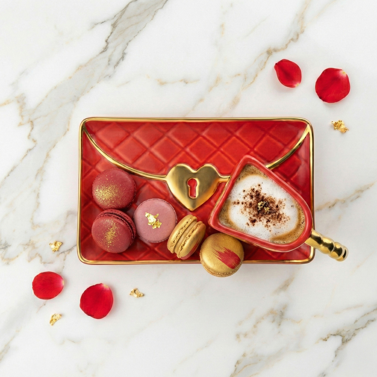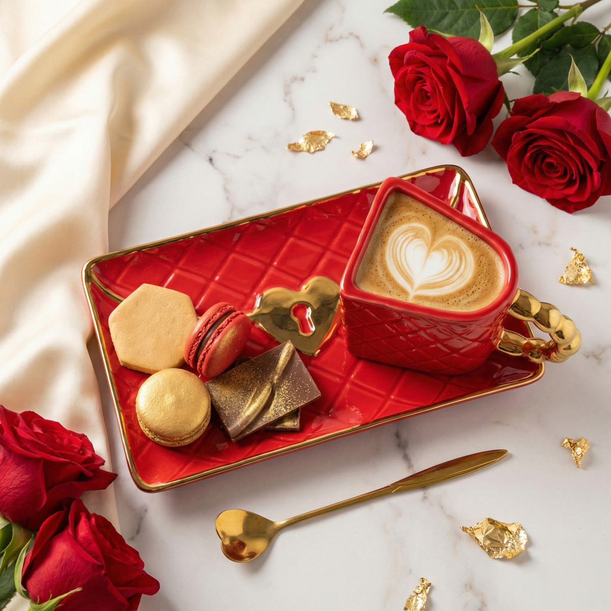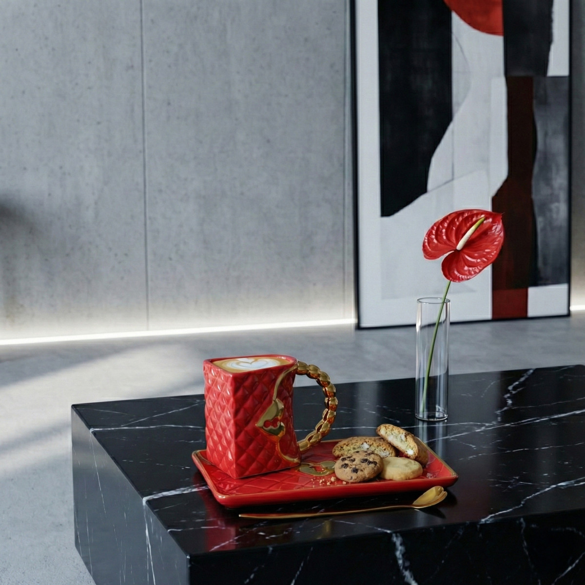 Šis išskirtinis kavos rinkinys sukurtas moterims, kurios vertina stilių, detales ir grožį net kasdienėse akimirkose. Raudonas rankinės formos puodelis, delninukę primenanti lėkštutė ir auksinis širdelės formos šaukštelis sukuria prabangų, mados įkvėptą derinį, kuris nepalieka abejingų.