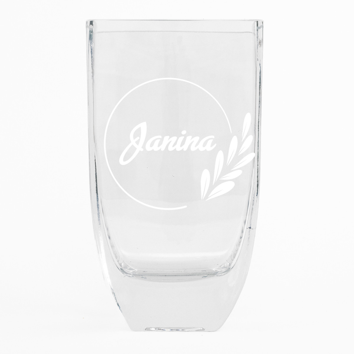 Stiklinė, lašo formos, graviruota vaza su užrašu "Janina". Puikiai tiks pasveikinti Janiną artėjančių Joninių dienos proga.
