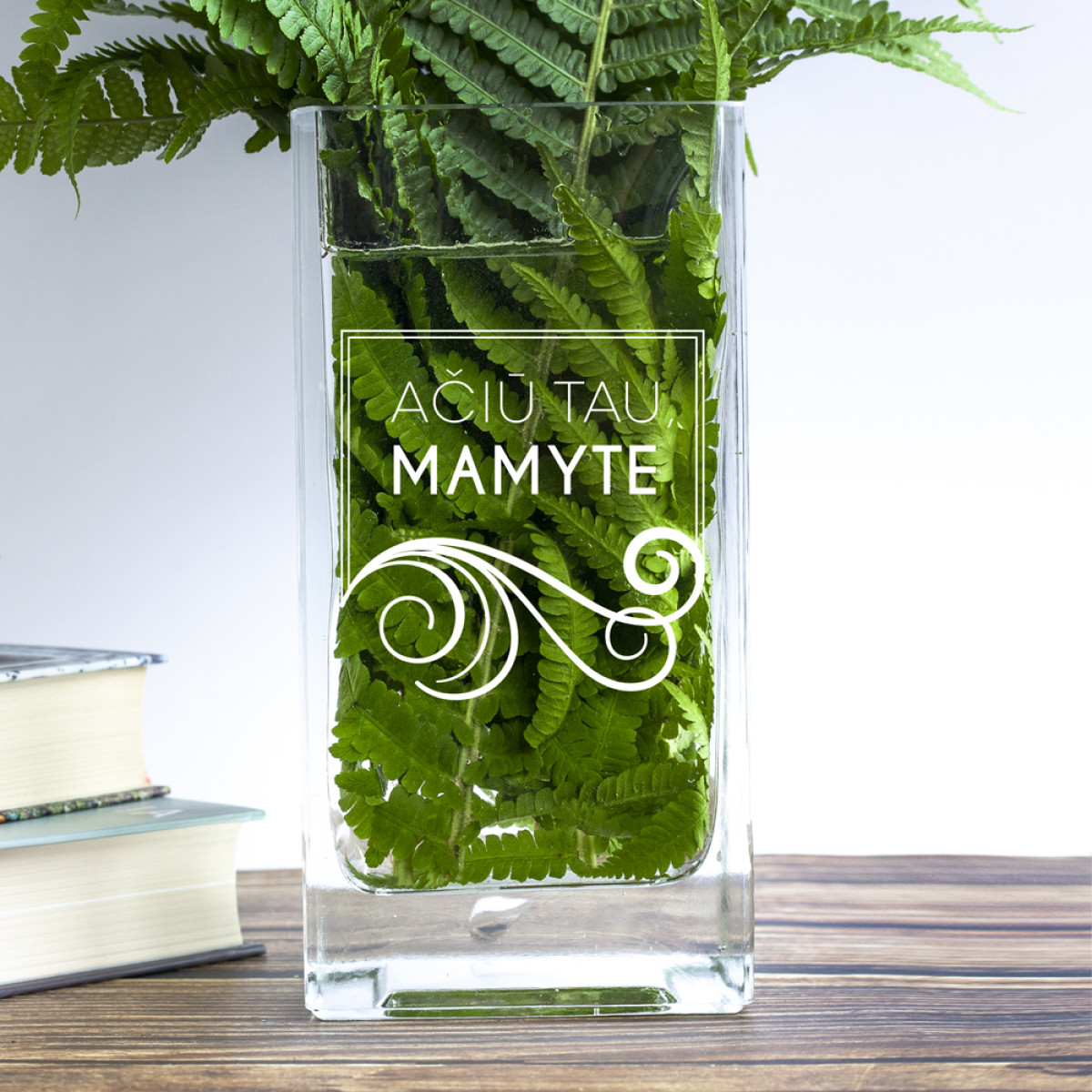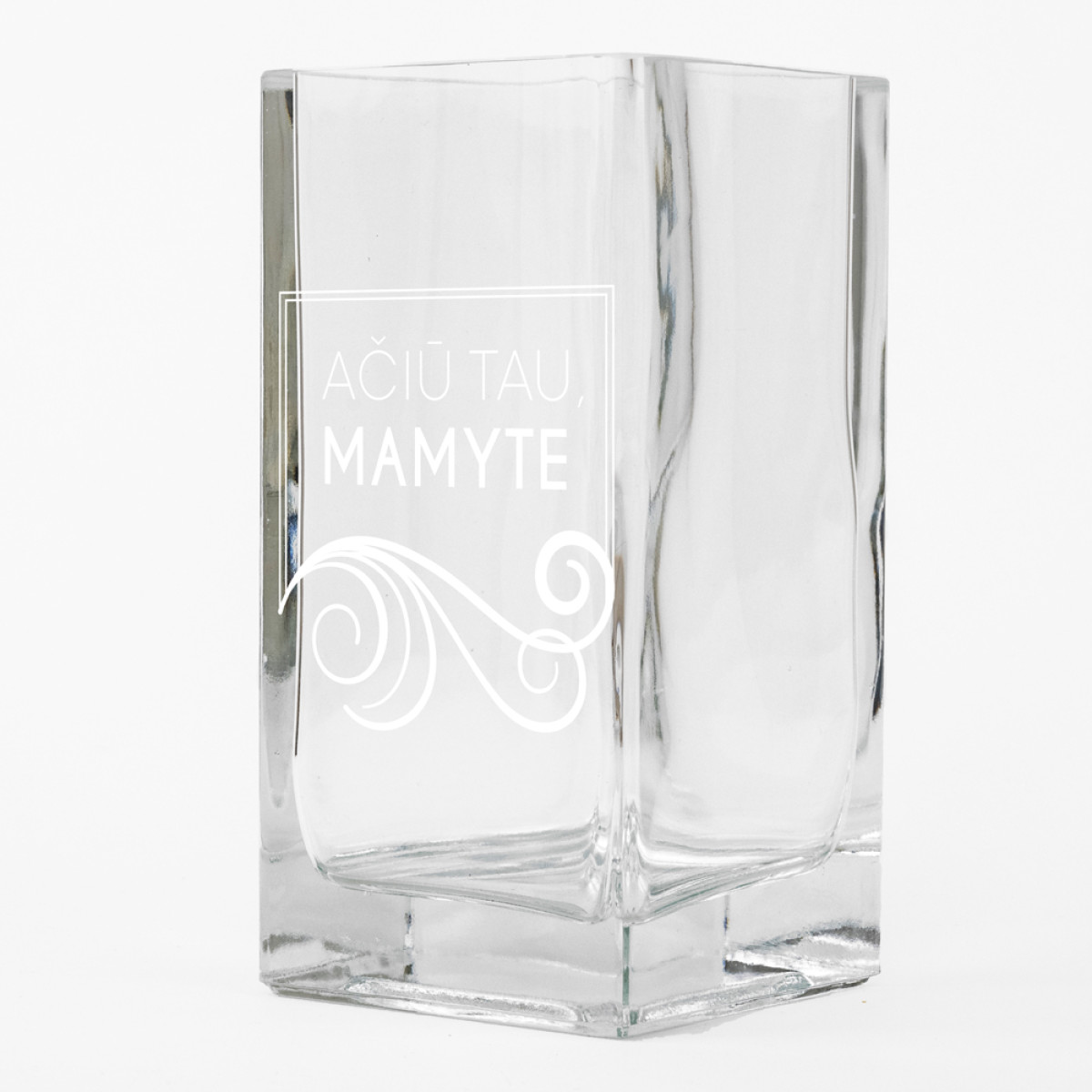 Itin žavi, stiklinė, stačiakampė, graviruota vaza su užrašu "Ačiū tau, mamyte".